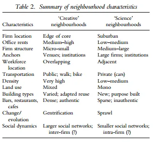 斯宾塞研究的主要发现是,这两种活动——基于科学的与创意产业——位于非常不同的地点。左侧的表格来自研究,总结了这些差异。