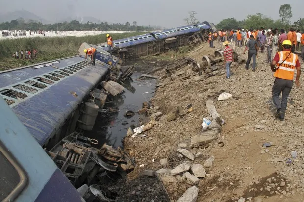 救援人员和旁观者站在2014年4月16日在印度东北部阿萨姆邦发生事故的客运列车出轨车厢旁。路透社但关于印度铁路网络基础设施健康的主要担忧——亚洲最大的——依然存在。它已经有超过 150年的历史,在某些地区显得老态龙钟。致命事故是 频繁发生。