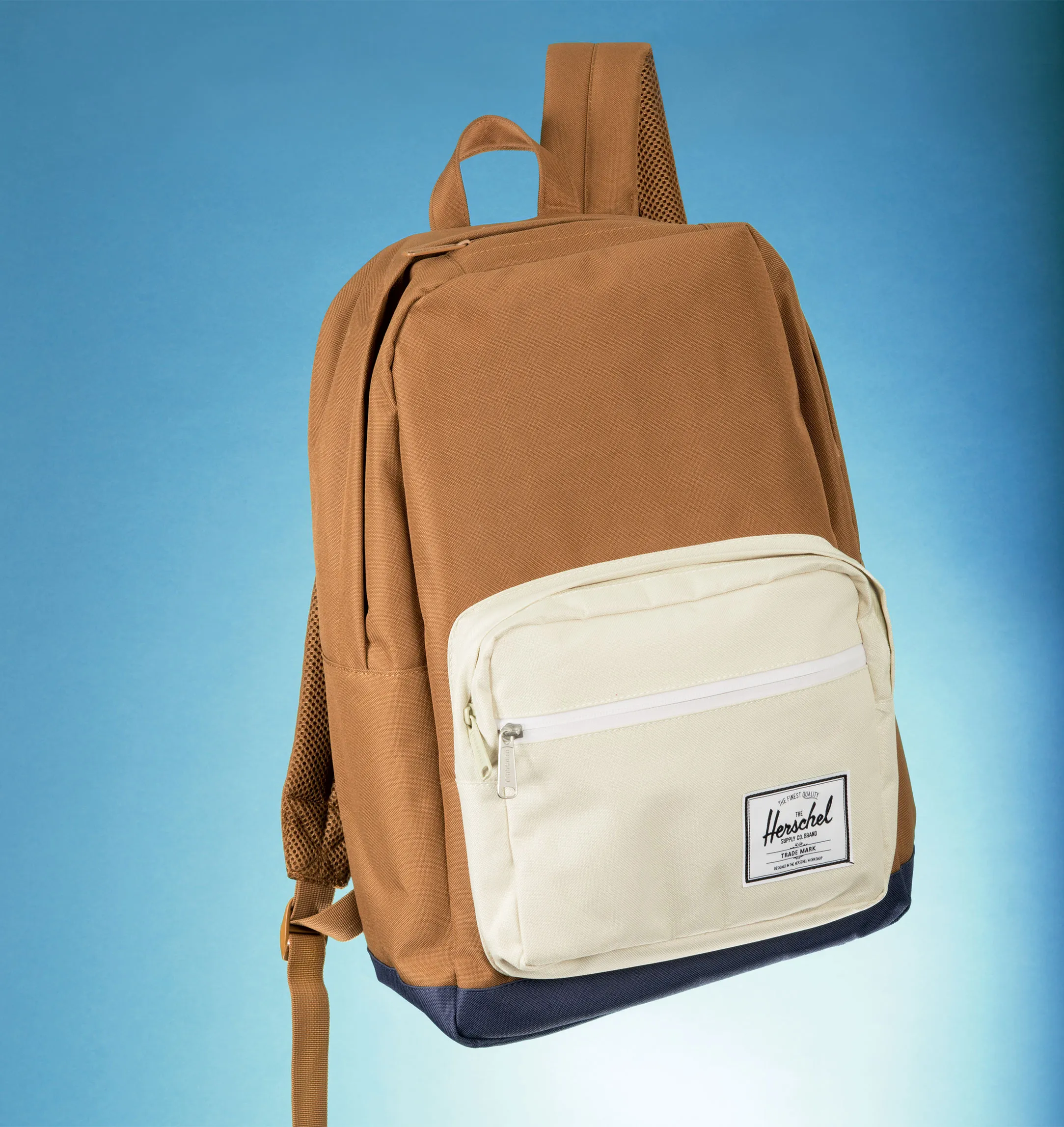 Herschel 背包是经典形式的重新设计。其中一种最热门的款式,Little America,是一个带翻盖的矩形,翻盖由 19 世纪矿工使用的那种带子和扣子固定。它的价格是 69.99 美元。Pop Quiz 也是同样的价格,看起来就像你记得在五年级时背的那种。但一些背包的元素采用了意想不到的颜色和组合——一个包可能有天蓝色的主体,白色的口袋配蓝色翻盖,以及品红色的带子。