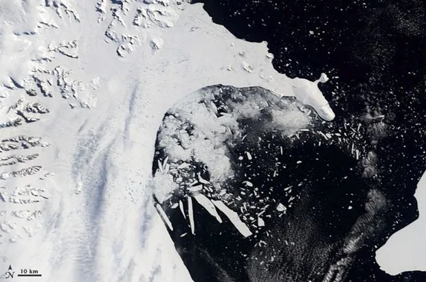 卫星捕捉到了快速升温的大陆惊人的崩溃,科学家认为这是由于一系列异常炎热的夏季造成的。这是冰架在一月份的样子: