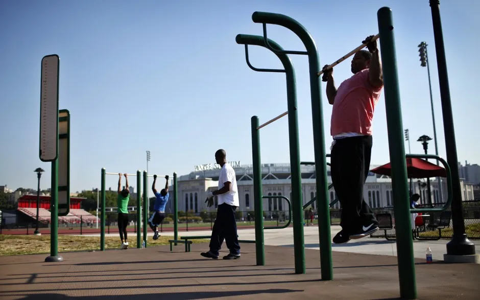 一群男人在布朗克斯的户外健身区做引体向上。路透社/迈克·塞加尔新的 美国健身指数报告 对全国50个最人口稠密城市的整体健身状况进行了排名。今年的榜首是:华盛顿特区。最后一名是:印第安纳波利斯。