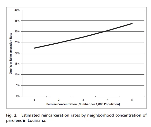 我的分析结果表明,社区中前囚犯的集中程度越高,随后的再犯率就越高。我发现将前囚犯集中在同一社区会导致显著更高的再犯率,而如果前囚犯在社区中更分散,则再犯率会降低。