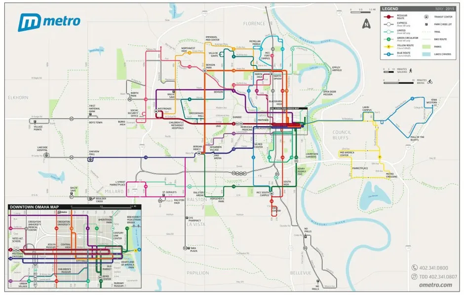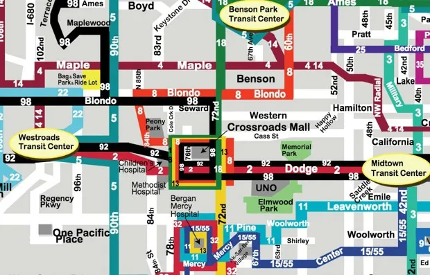 奥马哈大都会对于大众交通来说,与美国心脏地带的快速乡村道路和开阔空间竞争是非常困难的。以内布拉斯加州的奥马哈为例。人口和就业密度非常低,郊区非常分散,停车费用非常便宜,而行人基础设施则远非理想。该市的地铁公交系统每小时平均只有18次上车,而其34条线路中只有两条每15分钟发车一次——这是提供随到随走服务的最低标准。