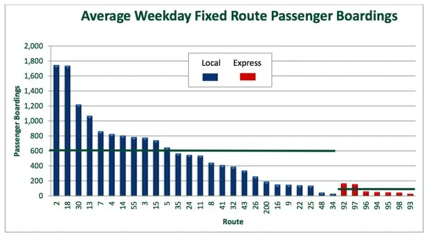 多年来,Metro对其系统进行了临时调整,以适应城市西部郊区的就业和住宅增长。“最终你会得到一个如此分散和拼接的系统,以至于它作为一个整体网络无法正常工作,”施韦茨说。结果是许多表现不佳的公交线路。根据一份2013年7月的网络愿景计划,Metro的前五条线路承载了系统整体客流的42%,而其后16条线路仅承载24%。