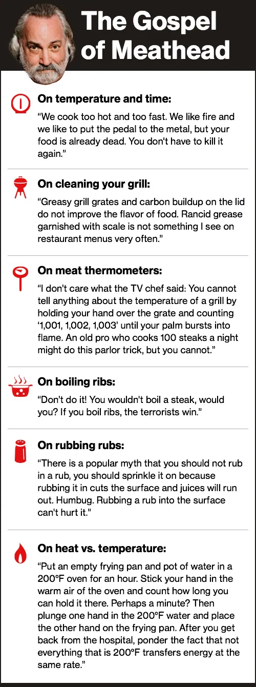 《肉头的福音》中的许多内容都在抨击烧烤的传统和公认的智慧——戈德温称之为“老公公的故事”。例如,最好的肋骨不一定会从骨头上掉下来,浸泡木屑是个错误,先煎再降温并不是烹饪厚牛排的最佳方法。