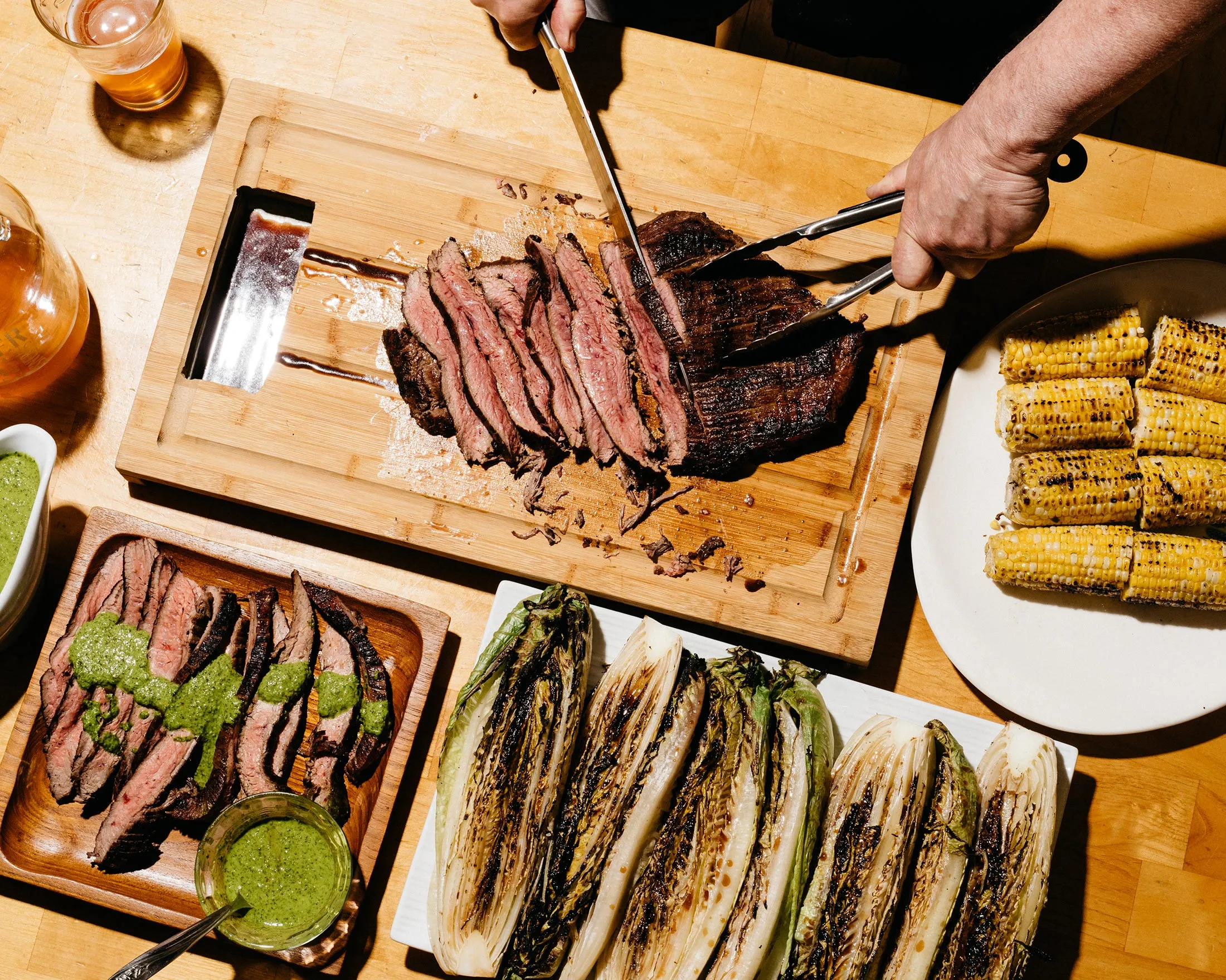 为了准备最近的午餐,他用干燥的葡萄藤填满韦伯烤炉,这些葡萄藤在燃烧时会冒出高达头顶的火焰,然后转为强烈、短暂的燃烧,适合三四分之一英寸厚的腹肉牛排。戈德温手持夹子和温度计在烤架周围跳跃,时不时戳一下牛排,寻找130度的中等生熟度。他在葡萄藤变成灰烬的瞬间宣布肉已经熟了。“用这些烹饪总是一场比赛,”他说。