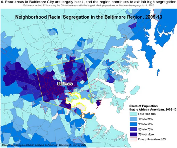 美联社图片最近的布鲁金斯学会 博客文章 展示了巴尔的摩经济和种族不平等的快照,揭示了 引发 动乱 的社会现实,紧随其后的是 警方引发的 弗雷迪·格雷的死亡。以下是艾伦·贝鲁比和布拉德·麦克迪尔曼: