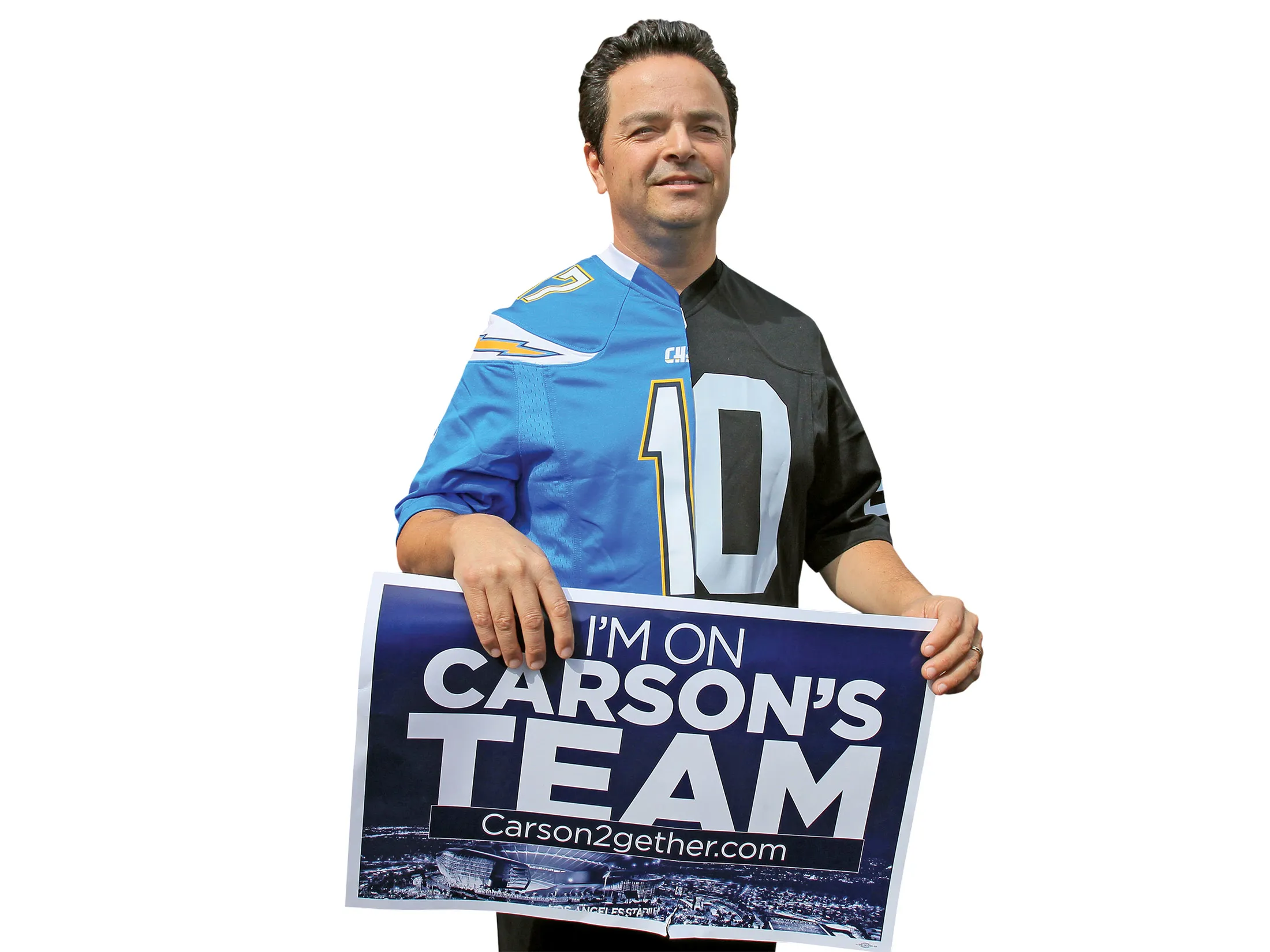 在作为这个拥有90,000人口的工人阶级城市的市长的第一个晚上,阿尔伯特·罗布莱斯换下了他标志性的分裂球衣,穿上了西装,球衣的颜色是突袭者和圣迭戈电光队的颜色。在罗布莱斯和其他两位市议会成员投票支持一座新的17亿美元、70,000座的体育场后,市长大声喊道:“足球要来卡森了!”人群发出热烈的欢呼。