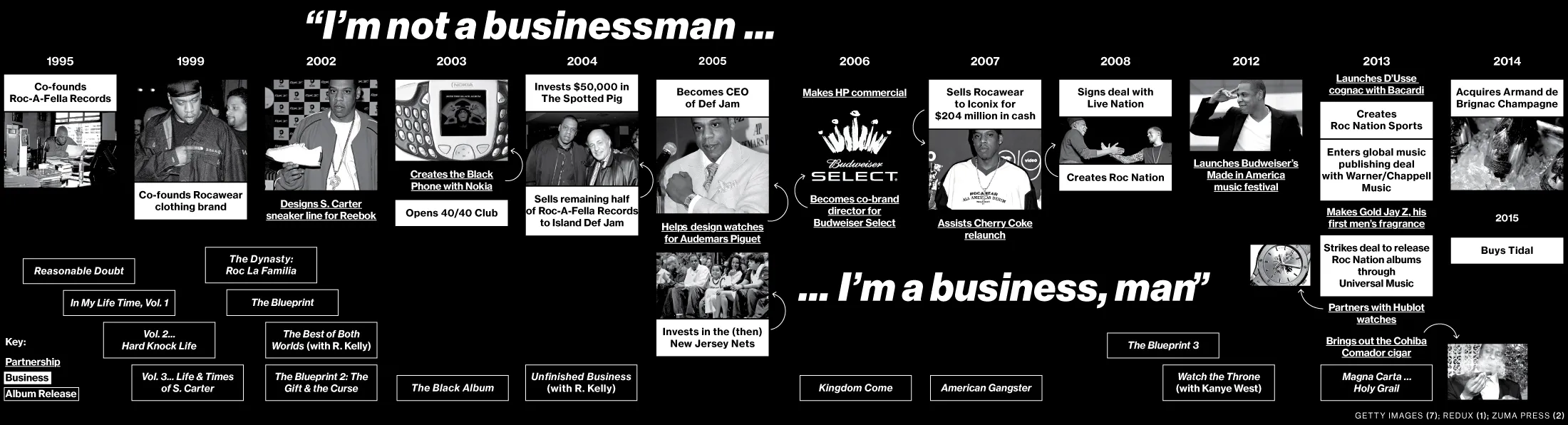 直到现在,Jay Z,真名肖恩·卡特,几乎保持着不间断的成功记录。作为一个嘻哈版的霍雷肖·阿尔杰,他从布鲁克林的马西公共住房项目的贫困中崛起,成为世界上最成功的音乐艺术家之一。根据尼尔森音乐的数据,他在美国独自售出了3400万张专辑。公告牌估计他去年从音乐活动中赚取了2200万美元。除了他的艺术才能,Jay Z还渴望成为世界上伟大的商人之一。“我与比尔·盖茨有联系,那是我的同行,”他曾在歌词中说道。而且:“你正在看黑人的沃伦·巴菲特。”
