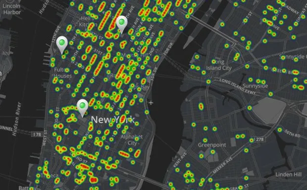 数据来源:纽约市开放数据 / https://data.cityofnewyork.us由个人伤害律师事务所委托制作这样一张地图是非常合适的,赫希特·克利格尔与达马谢克。这张地图是他们所称的 在纽约安全行走的终极指南的一部分。虽然它在保护你安全方面的实用性可能值得商榷,但它确实揭示了一些有趣的信息: