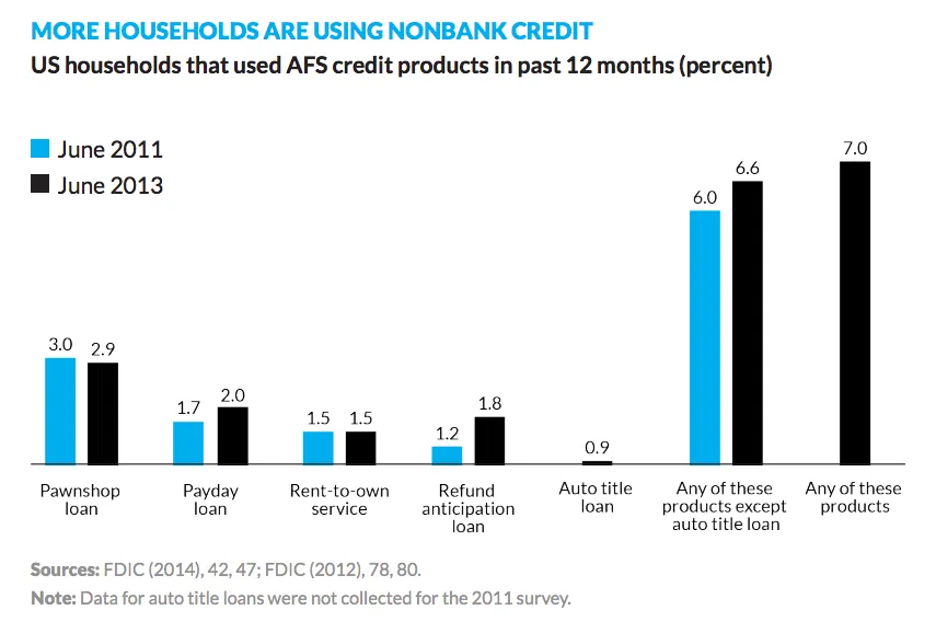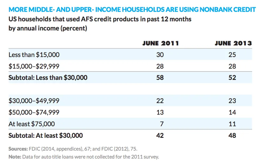 根据城市研究所的报告,在2011年至2013年间,使用替代信贷产品的家庭数量增加了7%。而寻求替代融资的家庭类型也在变化。