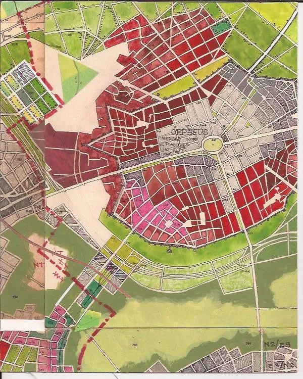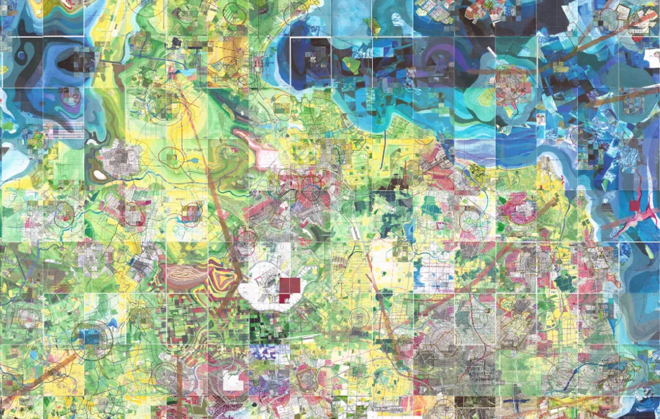 格雷茨辛格不断地逐块重新制作地图,遵循他从手工制作的卡片组中随机选择的一套复杂指令。这些指令告诉他何时需要重新绘制或重画某些特征,何时在农村地区添加“开发”,或在特定区域叠加新的拼贴。尽管这张地图最初是一个虚构地点的非常字面表现,但它已经演变成更具艺术性和抽象性的东西。结果是一幅明亮、有机的色彩、形状和文字的拼布,伴随着黑、白和灰色的尖锐块状干扰——这是格雷茨辛格最近逐渐引入卡片组中的一种神秘指令,他称之为“空洞”。