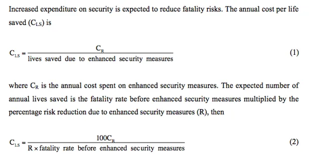 在2008年,澳大利亚纽卡斯尔大学基础设施性能与可靠性中心的研究人员试图计算在2001年9月11日袭击后美国实施的各种新安全措施的“每拯救一条生命的年度成本”。这篇论文现在有些过时,并且依赖于一些宽松的假设。但基本的探讨仍然是合理的,尤其是在关于TSA的揭露之后:美国全面的飞行风险缓解究竟花费了我们多少?