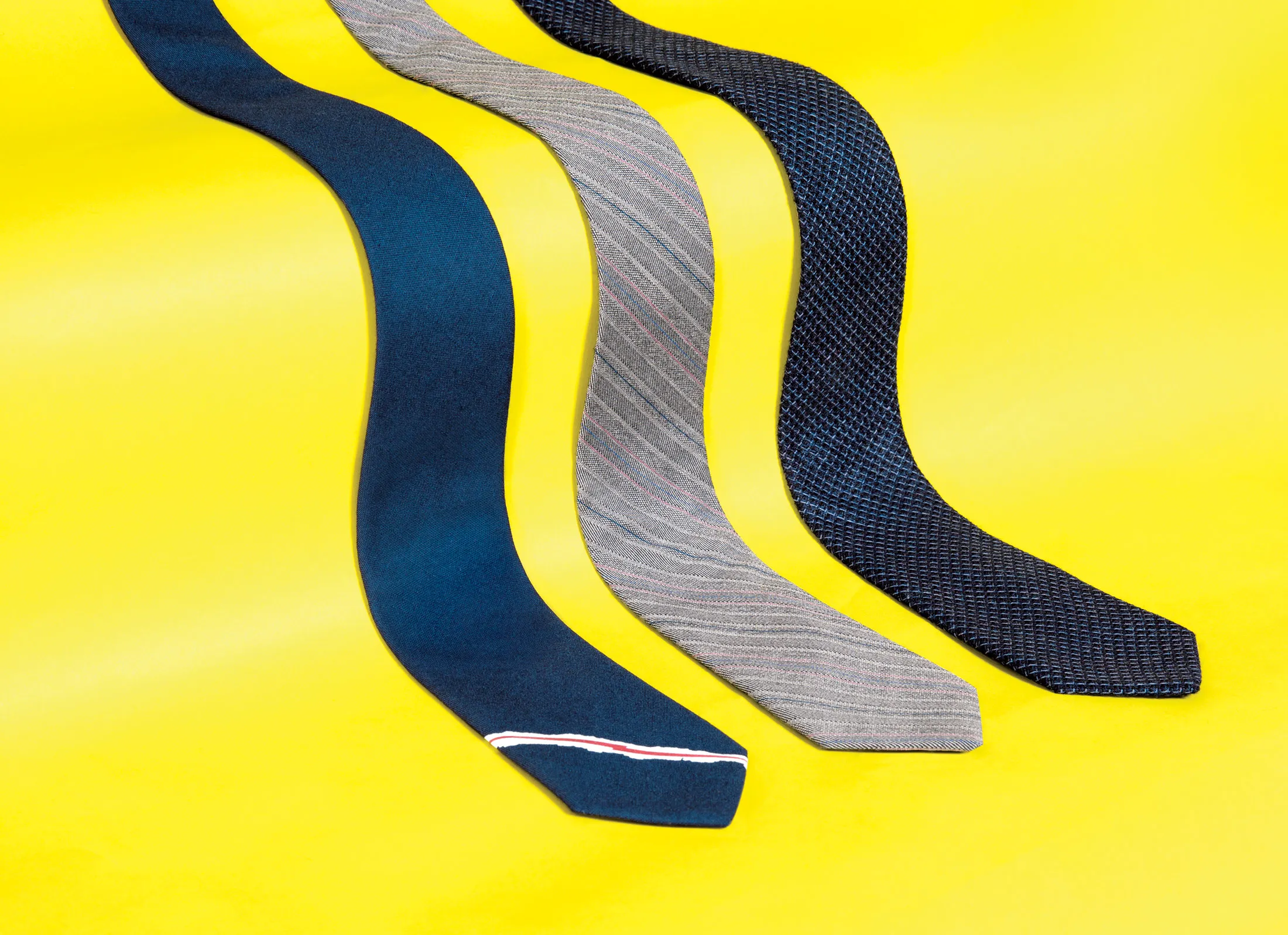 最近,领带的市场情况不太好。根据NPD Group的分析师,市场已经降至8.5亿美元——大约是90年代中期的规模的一半——因为穿西装的男性更倾向于选择普通的牛津衬衫或搭配西装外套的T恤。因此,Hammond决定用稍微闪亮的质地、只有在近距离才能注意到的鱼骨纹理,以及在某个实例中,基于他吉他背带设计的小红色闪电来更新这一传统配饰。