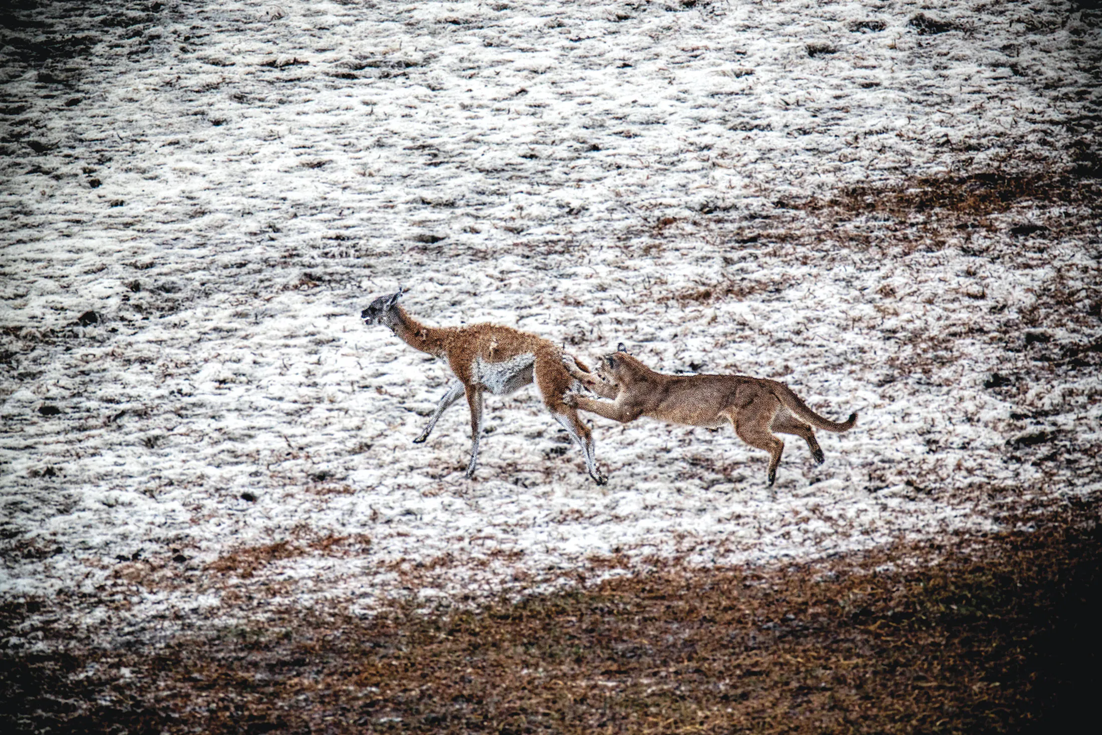 她从石头上滑下来,朝着一只美洲骆驼走去,我们尽可能地在悬崖边缘爬行,肚子贴着石头观看。当我们看到时,美洲骆驼已经在地上,但它只是装死。它猛地跳起,朝着一个干涸的湖床中间冲去,湖床上满是裂开的泥土。赫尔曼妮塔紧随其后。片刻之间,看起来他们要发生性行为,仿佛美洲狮正在骑在美洲骆驼身上。但这是生命的结束,而不是开始。美洲狮的爪子伸出,抓住那长长的细脖子,将动物扔到地上。它的腿无助地踢动。美洲骆驼倒下,然后又起来,再次倒下。美洲狮用窒息的咬合攻击,挣扎结束了。