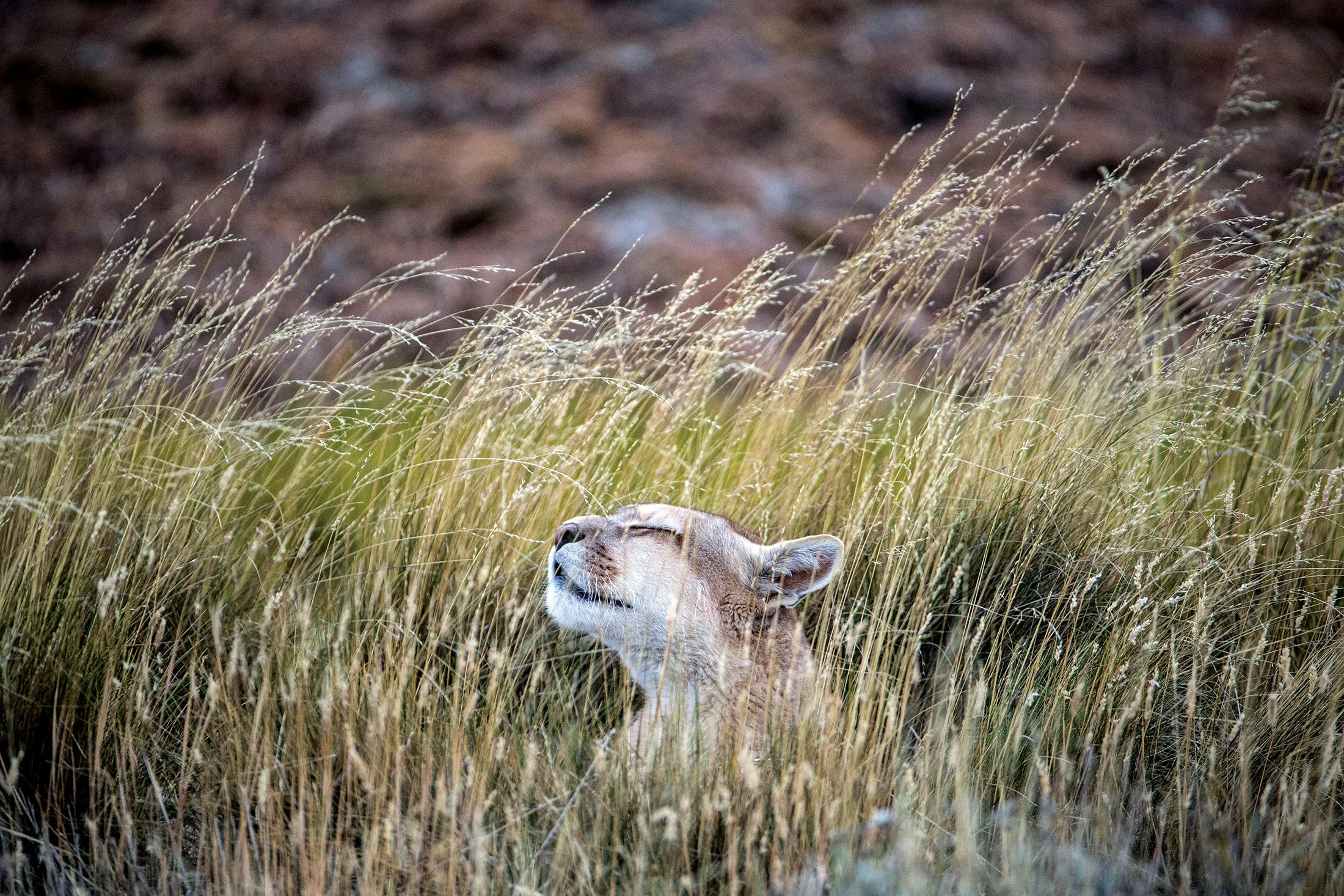 美洲狮天生孤独而害羞,若没有专业向导的帮助,在野外找到一只几乎是不可能的。我们的追踪员豪尔赫今天早上发现了一只年轻的雌性,所以现在我们蹲在一座布满刺的黄绿色灌木的小山上。那只猫在30码外的草丛中躺着。她的两只耳朵的三角形从高高的摇曳的草叶中露出。她的黑色鼻子偶尔抬起,嗅闻空气。这是我们两天内看到的第二只美洲狮。昨天,我看到一只在路边走。“就在那儿!”我说,难以相信如此野性的东西竟然如此接近。当我摸索着找我的相机时,那只动物悄然溜进了灌木丛中。我只捕捉到她消失时起伏的臀部。