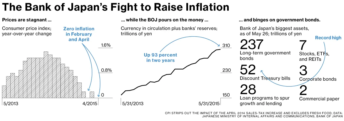 摄影师:太田清在5月29日,日本政府宣布该国4月份的消费者价格与去年同期持平,这对中央银行推动价格上涨的努力提出了质疑。日本银行的行为有点像对冲基金,尝试任何投资以实现将通货膨胀提高到2%的目标。它不仅购买政府债券,还购买交易所交易基金、公司债券、房地产投资信托和风险投资贷款——任何能够将更多资金投入贷方和投资者手中的方式,以便他们能够更多地借贷和投资。“日本银行在中央银行中应得最激进的奖项,”野村证券的高级经济学家高桥康宏说。