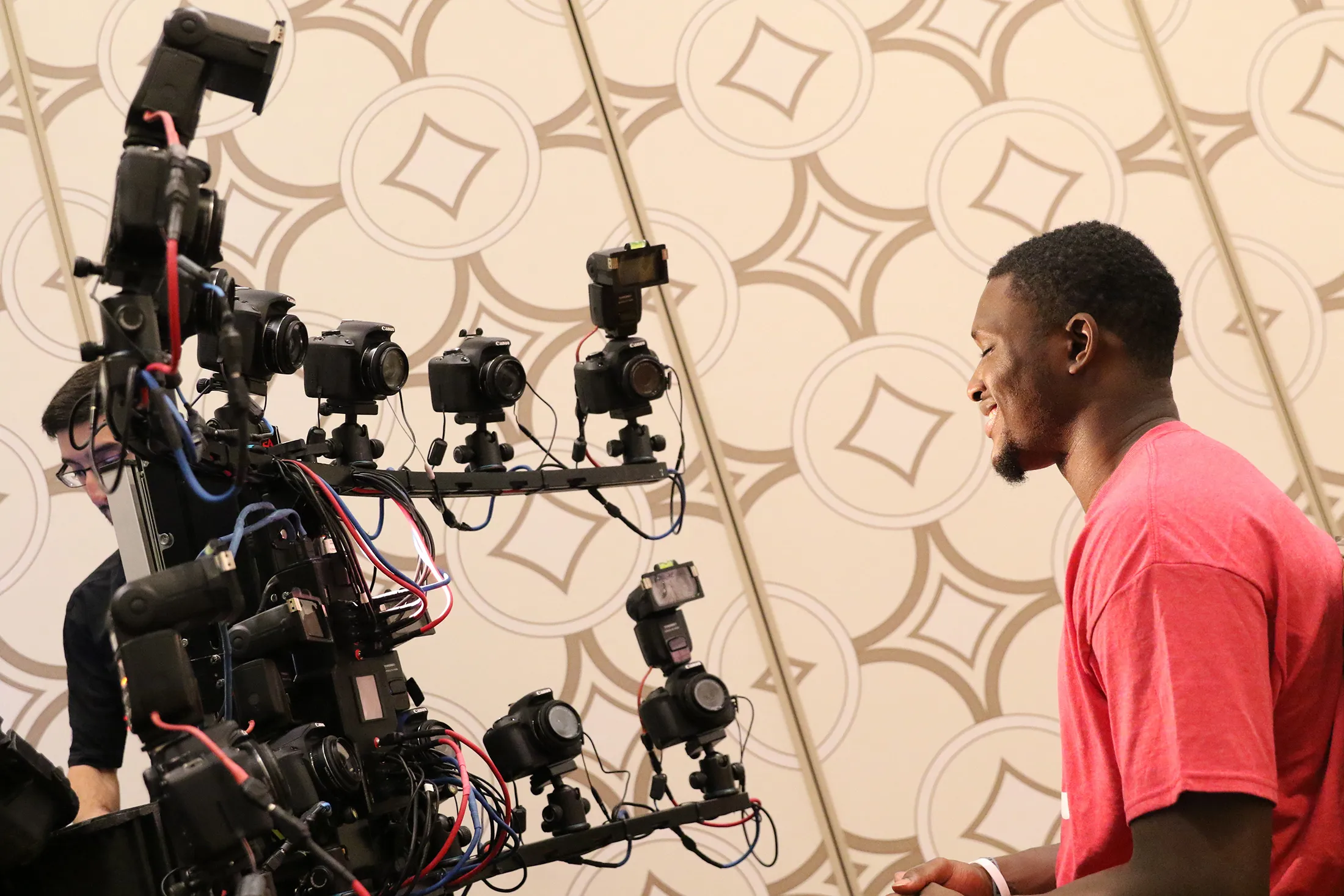 卡洛斯·威廉姆斯,布法罗比尔队的跑卫,面对EA Sports的摄像机微笑,他们正在为新的*《麦登 ‘16》*足球游戏捕捉他的形象。