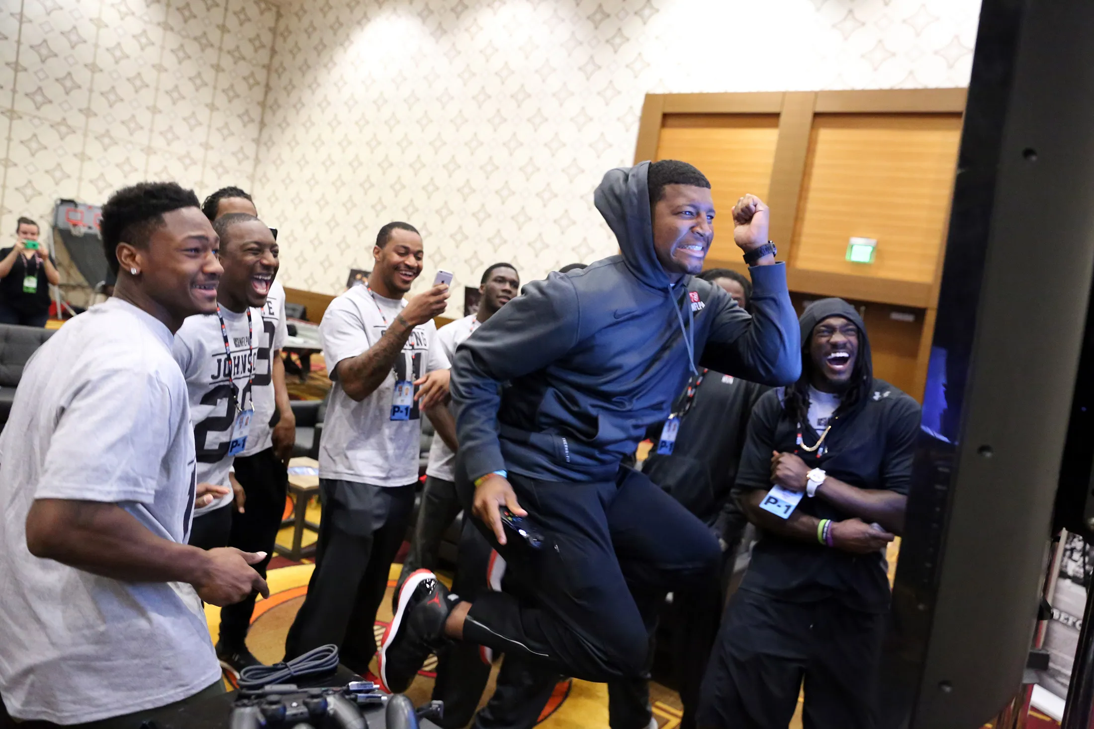杰梅斯·温斯顿,2015年NFL选秀的第一顺位选手,与其他球员一起玩视频游戏。来源:凯文·A·科斯基/NFLPA交易卡制造商Topps和Panini America在新秀首映会上仍然扮演着重要角色。他们帮助选择受邀者,重点关注“将会被收藏的”球员,帕尼尼的市场副总裁杰森·霍华斯说。这主要意味着四分卫、跑卫和外接手。布雷特·亨德利,一名被绿湾包装工在第147位选中的四分卫,出现在活动中。布兰登·舍夫,一名被华盛顿红皮队以第五顺位选中的进攻线员,则没有出席。