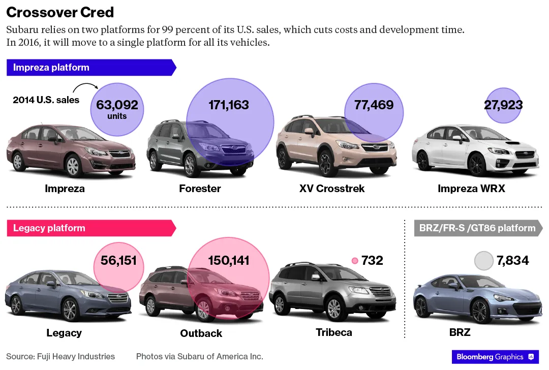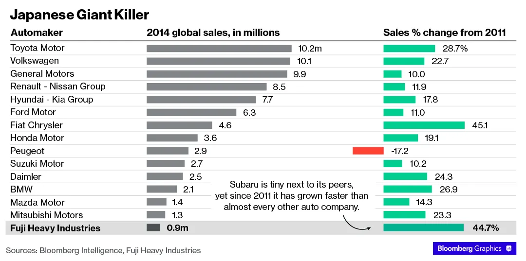 然而,该公司却完全不适合应对销售激增。去年,全球最大的汽车制造商丰田每三秒就售出一辆汽车,而斯巴鲁则需要35秒才能离开停车场。几乎任何一个可以提到的汽车公司都比小小的富士重工业(斯巴鲁的母公司)大得多。宝马?在单位销量上大于两倍。起亚?几乎是三辆斯巴鲁。甚至马自达的销量也多出50%。