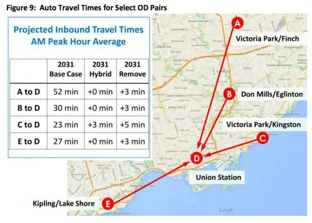 多伦多正在辩论是否拆除加尔德纳高速公路并将其改造成地面林荫大道(上)或以“混合”选项维持它(下)。迪伦咨询### 三分钟的延误值多少钱?