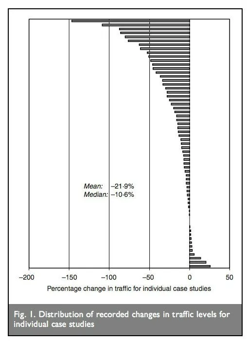 这种“消失的交通”现象已经被仔细研究,似乎是一个相当一致的现象。一篇 2002年的论文,研究了将道路空间从普通交通汽车重新分配到其他模式的70个案例,报告了交通减少的中位数为11%,总体平均下降为22%: