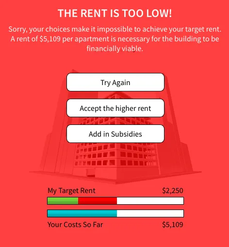 如果你建造了一座中层建筑并实施了基本设施,你将处于亏损状态。估计成本为5,109美元,远超过你从租金中能收回的金额。但如果你选择政府的建筑补贴,以及物业税减免,你的成本将为每个单元1,927美元。