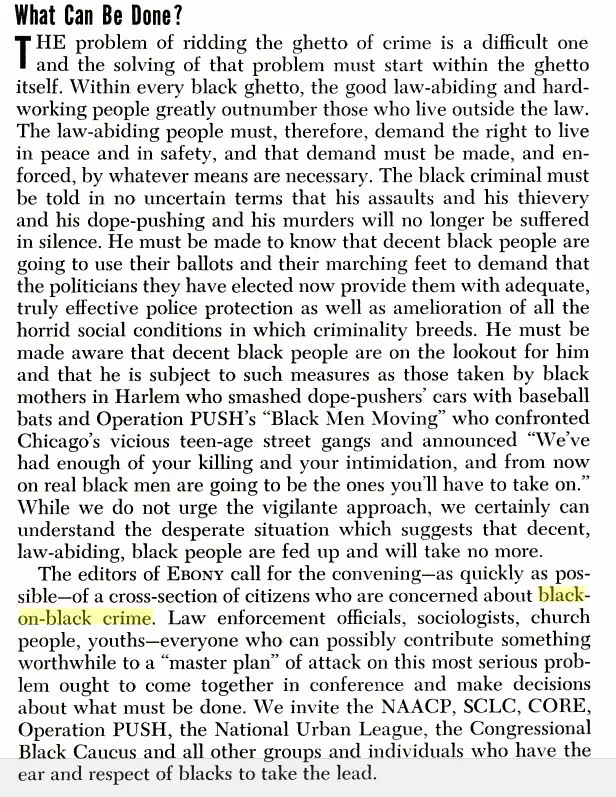 不久之后,讨论的语气开始转变,从黑人作家指责白人官员忽视黑人社区犯罪受害者,转向直接指责黑人社区本身。请查看这篇社论,发表于1973年11月的非裔美国人杂志乌木上,宣称“必须明确告诉黑人罪犯,他们的攻击、盗窃、贩毒和谋杀将不再被沉默忍受。”