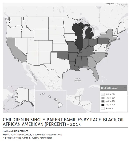 一些人可能试图将这些州的双亲家庭比例低与其庞大的非裔美国人群体联系起来。不是的。正如安妮·E·凯西基金会的儿童计数地图所示,在单亲家庭中非裔美国儿童的比例方面,南方州和北方州之间的差距较小。在单亲家庭中,非裔儿童比例最高的州位于北方。