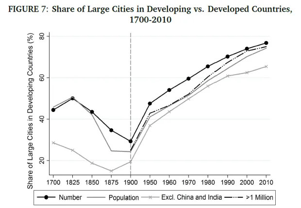 到1950年,研究人员发现又一次转变,回归发展中国家。在20世纪中叶,世界上45%的特大城市再次位于发展中国家。这个比例持续上升:到2010年,世界上近80%的特大城市位于发展中国家。浅灰色线条显示了这些相同的趋势,排除了人口巨头中国和印度,模式依然成立。这表明,贫穷国家与快速城市化之间的关联不仅仅是由于少数大型发展中国家的人口爆炸;对于较小的国家也是如此。
