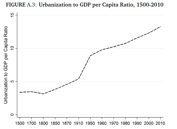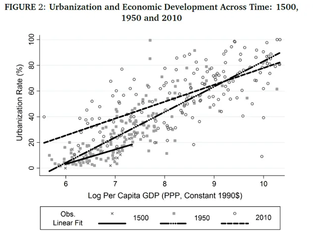 Jedwab和Vollrath但是,城市化与增长之间的关系性质在不同时间段内变化很大。下图显示了城市化与经济发展在三个不同时间段(1500年、1950年和2010年)之间的关联。