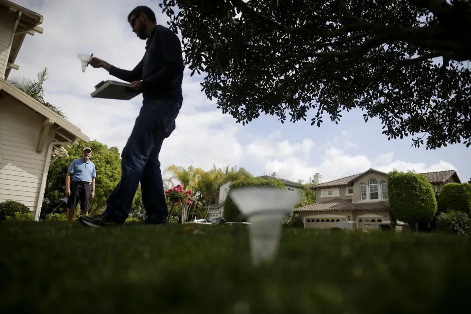 格伦·彼得森(左)观看圣地亚哥县水务局的水资源保护专家丹·丹宁在加利福尼亚州卡尔斯巴德检查他草坪上的喷灌流量。美联社照片/格雷戈里·布尔加利福尼亚州对水资源保护越来越重视:近40年来首次对许多最古老的水权持有者强制削减,其中许多人是农民。这是在州长杰瑞·布朗呼吁州内城市和城镇减少25%之后仅几个月的事情——而且该州正进入连续第四年的干旱夏季。尽管农业用水将难以监测,但不遵守的城市用户将面临一系列罚款。