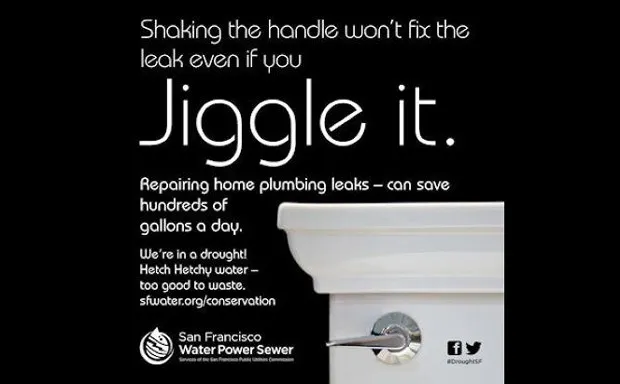 旧金山公共事业委员会让旧金山把节水变成一种稍显挑逗的事情:该市的“节水既聪明又性感”宣传活动展示了光滑水景的诱人镜头,以及一些暗示性的信息,比如“更换你的旧马桶并获得报酬为此。