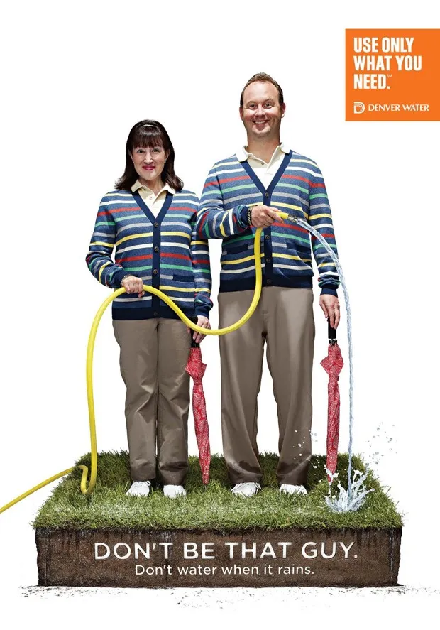 科罗拉多州的丹佛在他们的保护宣传中采取了截然不同的策略。或许是受到以#droughtshaming为代表的幸灾乐祸式标签的启发,丹佛官员只是想让你感到内疚。2014年的“用你所需”运动提醒市民不要成为“那个人——你知道的,那个在指定时间外给他的草坪浇水的博美犬主人,或者那个在下雨时让喷头继续工作的情侣。