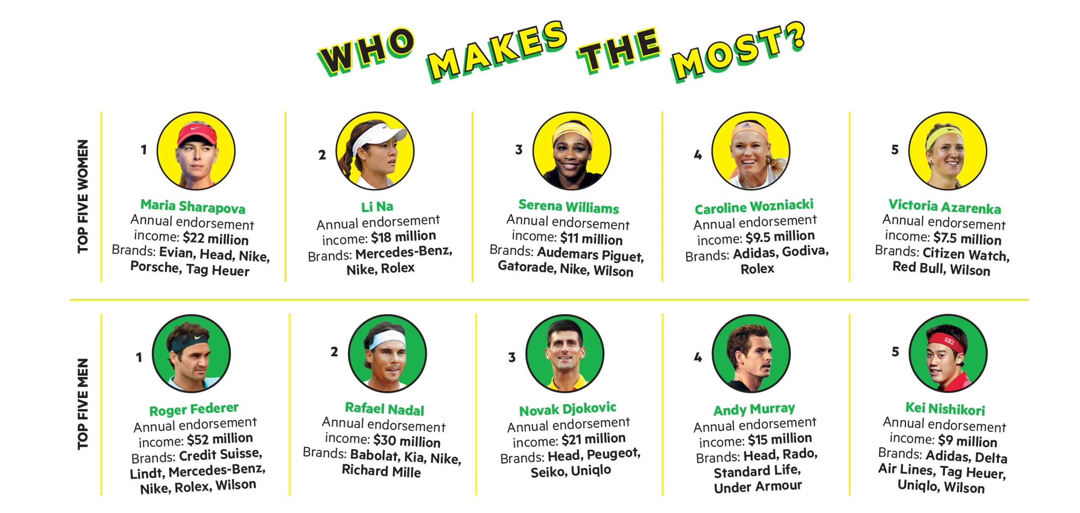 在赢得2012年WTA保时捷网球大奖赛后驾驶保时捷。摄影师:Scott Barbour/Getty Images尽管如此,第二名也有其安慰,尤其是如果你又高又金发。根据福布斯的数据,莎拉波娃是世界上收入最高的女性运动员,并且在过去十年中一直位居榜首。她在2014年通过代言赚取了2200万美元,包括与耐克签订的为期八年、价值7000万美元的合同,与依云的五年合同,以及与Cole Haan、泰格·豪尔和其他品牌的合作。威廉姆斯也与耐克有合作,同时还有与佳得乐的合同,每年落后她超过1000万美元。
