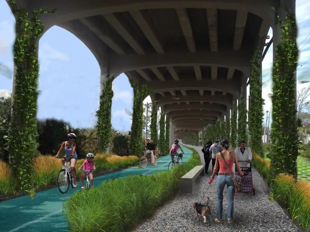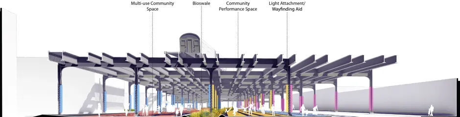 设计信托设想了一种导向系统,由涂刷各种颜色的高架梁组成。这些颜色可以帮助将该区域划分为各种社区用途,包括公园、农贸市场和街头集市。百老汇交汇处的计划已经在进行中:城市规划部门获得了一项HUD赠款,以开始开发该空间的一些想法。