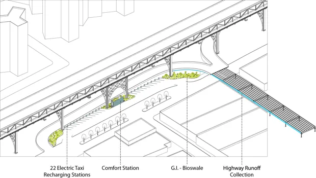 对于该空间的一个想法(如图所示)是创建电动车充电中心,并且(如果城市最终决定转换其车队)出租车。司机的休息站也可以设在那里,让他们在等待时有事情可做。设计信托看到桥下有几个地点可以作为更广泛城市网络中的充电中心。