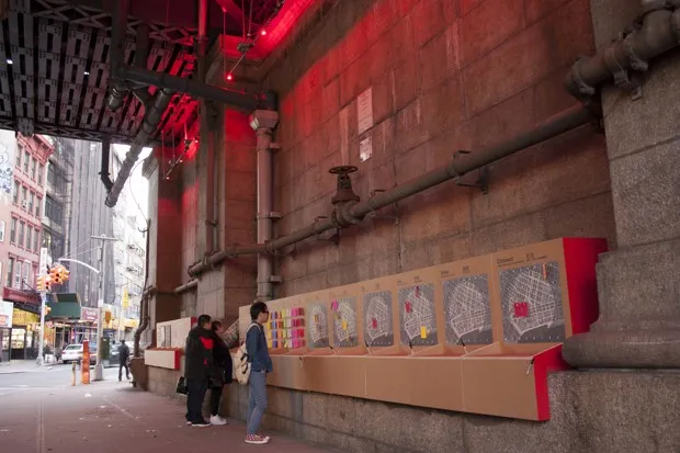 曼哈顿大桥下的快闪装置为当地居民创建了一个社区日历。尼尔·唐纳利 / 感谢公共空间设计信托位于唐人街的分区街下的曼哈顿大桥,被高架下描述为“因车辆排放和桥面径流而黑暗肮脏,因上方列车运行而嘈杂。” 这并不是一个特别愉快的地方。 但在2014年4月,当设计信托和交通局安装了一个快闪社区日历和红色LED灯光时,它至少变得引人入胜。