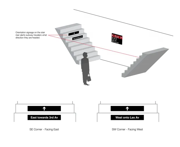 我们之前写过关于高效乘客项目,该项目使用贴纸标记站立位置,以优化线路之间的换乘。最近,罗德岛设计学院的学生瑞安·墨菲,着手将同样的想法应用于离开车站。他针对一个臭名昭著的混乱的上东区出口,位于4/5/6线,在那里一块单一的MTA标志引导乘客到街区的东南角,却有箭头指向相反的方向。