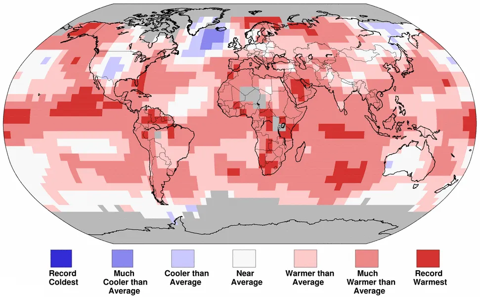 下面的动画展示了地球变暖的气候,记录了超过135年的陆地和海洋的月度测量。温度以高于或低于20世纪平均值的度数显示。14个最热年份中有13个在21世纪,而2015年有望再次打破热记录。甚至没有接近。