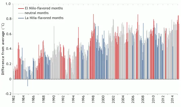 下图显示了自1982年以来的全球温度,厄尔尼诺时期用红色标出,拉尼娜用蓝色标出,中性时期用灰色标出。