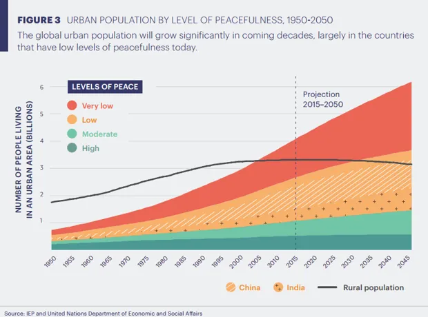 暴力最为猖獗的国家也是预计在未来几十年将迅速城市化的国家。虽然更大的不平等与更暴力的社会相关,但这种关联相对温和,且不如人们想象的那样明显,与全球和平的相关性为-0.18。而且与失业率没有相关性。这表明,和平与暴力与经济发展水平和后工业转型的关系比与不平等或失业本身更为密切。