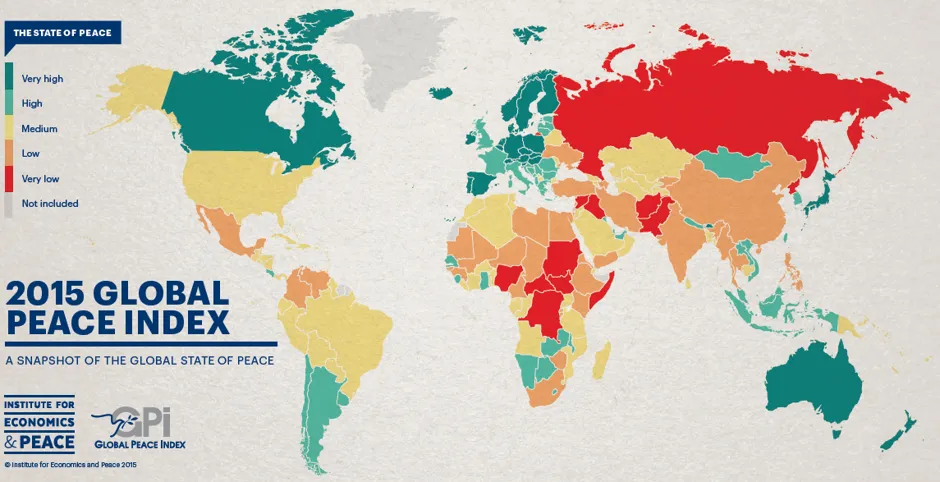 根据报告,全球和平的下降更多是由国家内部冲突驱动,而不是国家之间的暴力。2013年,国内恐怖活动造成的死亡人数激增了令人不安的61%;那一年,恐怖分子杀害了近18,000人。这些死亡中有82%——14,800人——发生在仅仅五个动荡不安的国家:伊拉克、阿富汗、巴基斯坦、尼日利亚和叙利亚。但相对和平的欧洲国家——法国和丹麦——以及亚太国家——澳大利亚——最近也遭受了恐怖袭击。联合国估计,由于冲突和暴力,现在有超过5000万人是难民或国内流离失所者——地球上每133人中就有1人。当这个数字在2014年超过5000万时,这是自第二次世界大战以来首次有如此多的人被迫流离失所。
