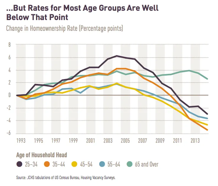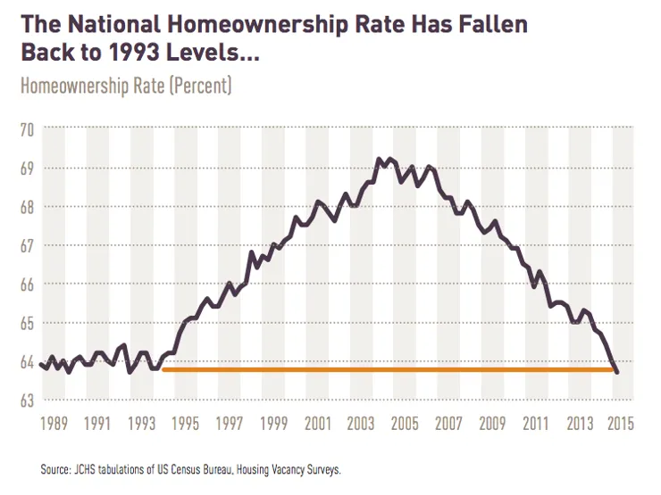哈佛大学联合住房研究中心的一份新报告为X世代购房者带来了坏消息,更糟糕的是,千禧一代在一旁等待的消息。根据 2015年国家住房状况 报告,房屋拥有率降至自1993年以来的最低水平。而且没有任何改善的迹象。