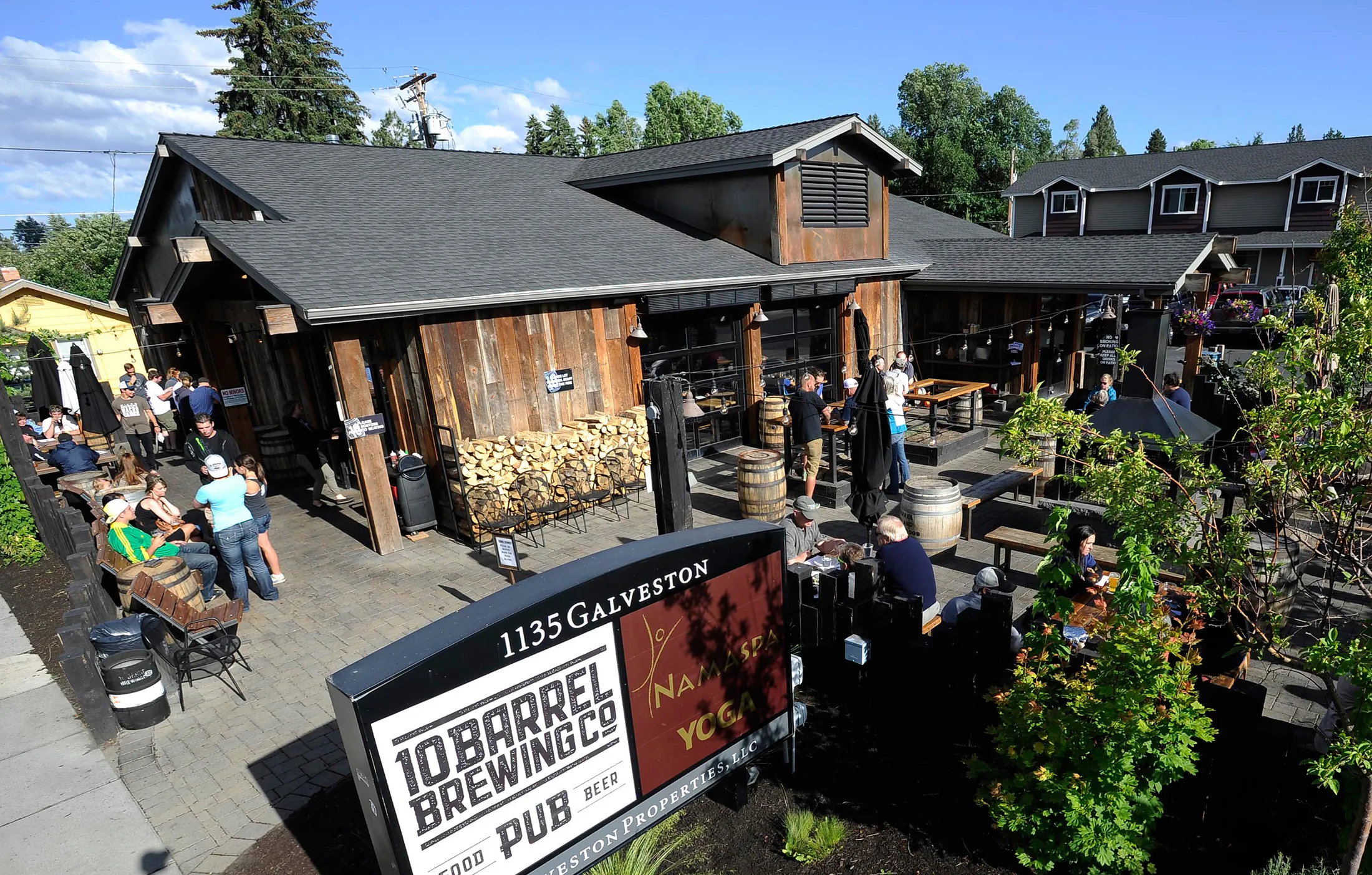 位于俄勒冈州本德的10 Barrel Brewing的户外座位区,这是被安海斯-布希收购的酿酒厂之一,安海斯-布希是安海斯-布希InBev在美国的分支。