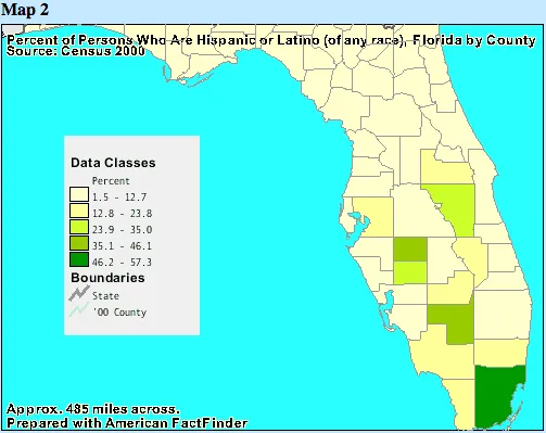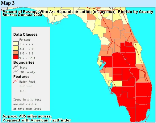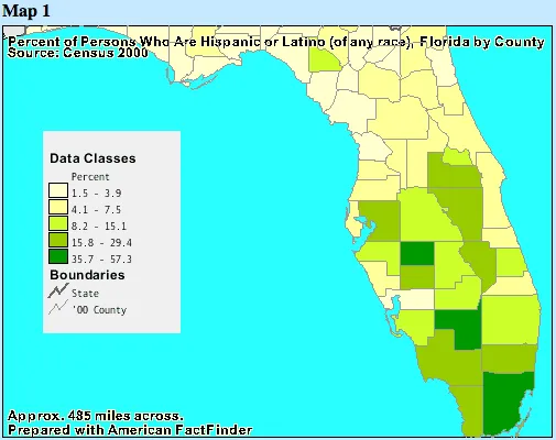 通常,制作一张将数据分为相等区间的地图是正常的——按县划分的人口从1-10,000,10,001-20,000,20,001-30,000,等等。然而,有时这种逻辑组织并不是呈现信息的最佳方式。如果制图者想要突出或隐藏某些内容,操纵类别分界线(这些分组之间的分隔线)就很容易,将所有高值或低值放入一个大类,同时将其他值分成各自的类别。通过这种方式,你强调了数据的一部分,同时隐藏了另一部分。一个很好的例子是这些佛罗里达州西班牙裔人口的地图: