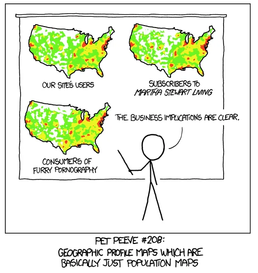 XKCD这个笑话在于每张地图实际上只是一个人口地图,更多的人往往会做更多的事情。上面提到的GDP地图实际上也只是一个人口地图——在有更多人的地方,GDP也更多。