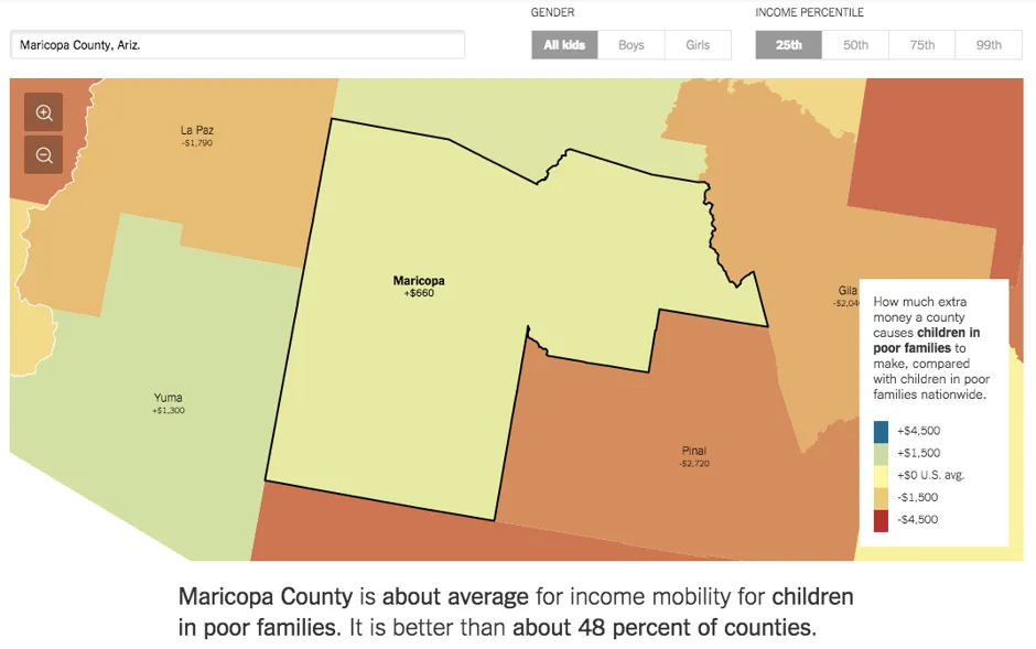 纽约时报数据呈现得非常吸引人,令人印象深刻的是,地图实际上会根据你阅读的地点而变化,但标题并没有真正展示它所声称的内容。如果你只是看地图并认为某个地方好或坏,你就错过了整个故事。亚特兰大或丹佛是成长的坏地方吗?最好的地方是怀俄明州、犹他州、达科他州以及农村明尼苏达州和爱荷华州吗?这取决于你认为的最好和最坏。