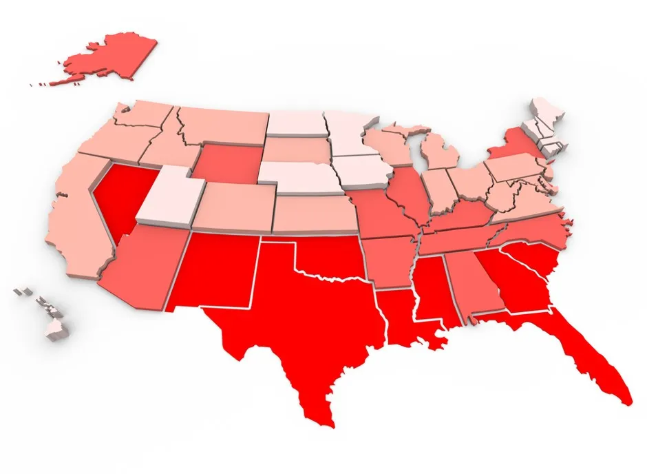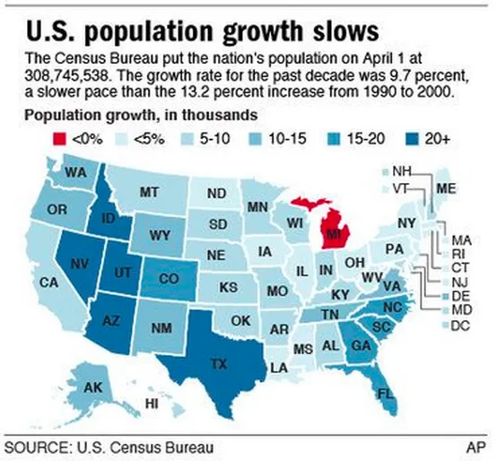 这也可能是无意的:人们可能会假设某些东西是坏的,如果它是红色或不同的颜色,即使事实并非如此——而红色也往往会使人们的视线偏离更微妙的颜色。一个令人困惑的例子是美联社的一张地图,显示了 各州的人口增长: