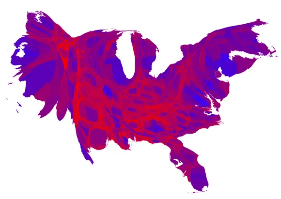解决这个问题的一种方法是 一个卡托图,这是一个图形,其中的区域单位(在这种情况下是县)根据其人口大小进行调整,因此人口更多的县看起来会大得多。
